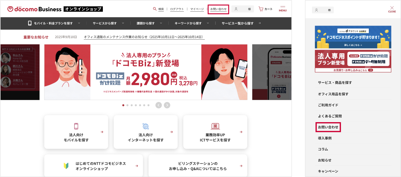 注文後のお問い合わせにつきましては、ログイン後、ヘッダーの「お問い合わせ」または画面右上のMENUからフォームにてお問い合わせが可能です。