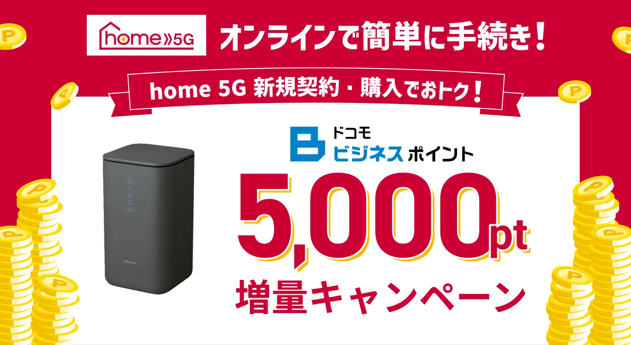 キャンペーン期間中にhome 5G プランを新規でご契約・ご購入されたお客さまに対し、ドコモビジネスポイントを+5,000pt進呈します