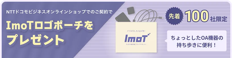 オンラインショップ限定!ImoTの料金プランをご契約いただいた先着100社限定で、ImoTロゴポーチをプレゼントします。(本キャンペーンは予告なく終了する場合がございます)