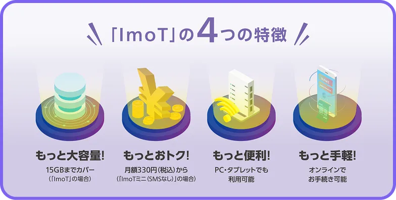 LTE高速通信をご利用されるお客さま向けに15GB/月まで高速通信可能な「ImoT®」、