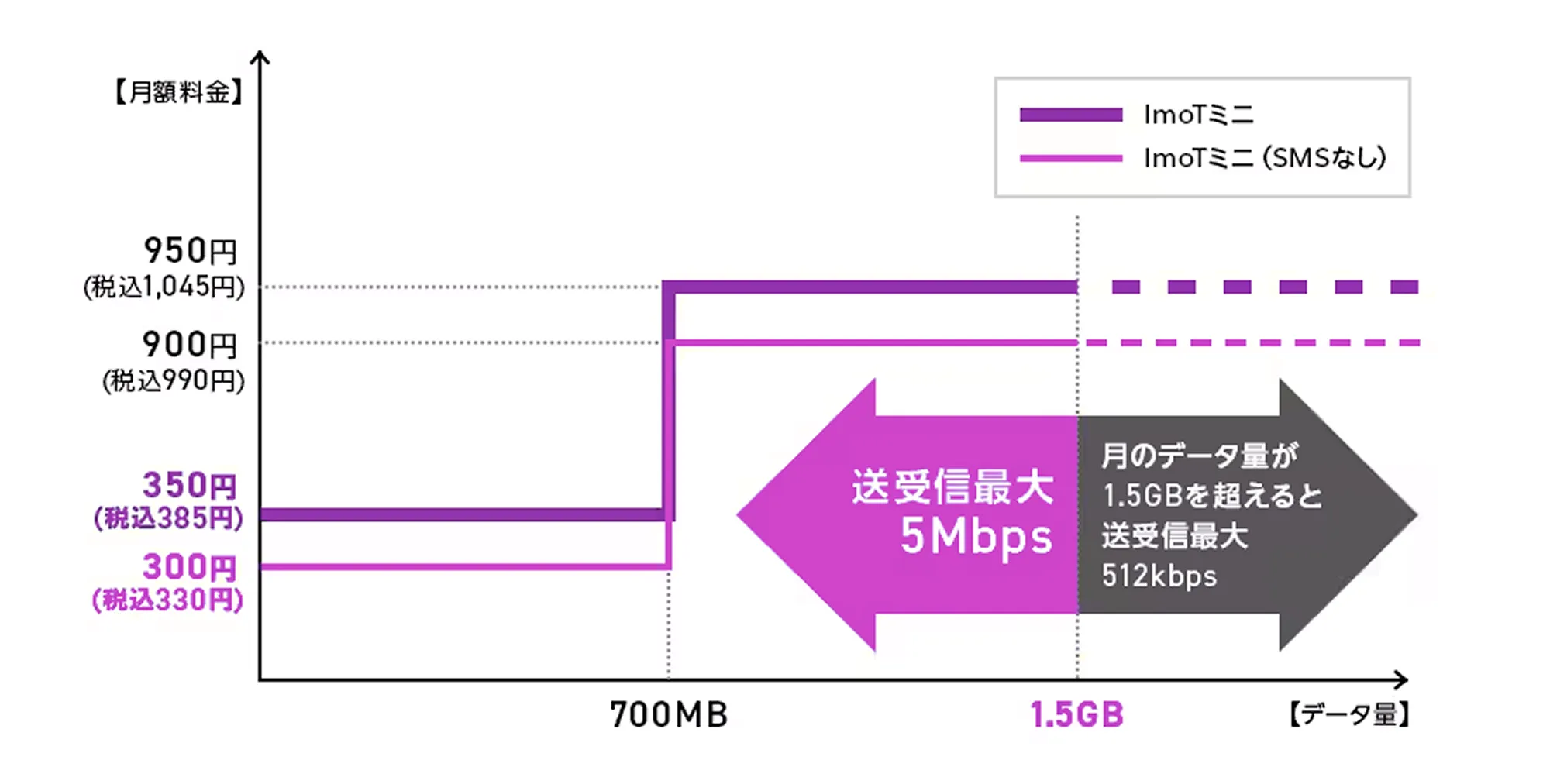 - 「ImoTミニ」「ImoTミニ(SMSなし)」はLTE送受信最大5Mbpsにてご利用になれます。当月ご利用データ量が1.5GBを超えた場合、当月末まで通信速度はLTE送受信最大512Kbpsとなります。