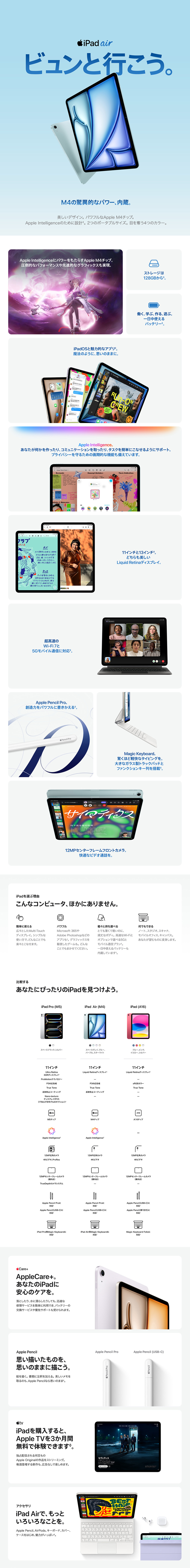 - アクセサリ:アクセサリは別売りです。互換性はモデルと世代によって異なります。iPad(A16)で使用するにはUSB-C - Apple Pencilアダプタが必要です。在庫が限られている場合があります。