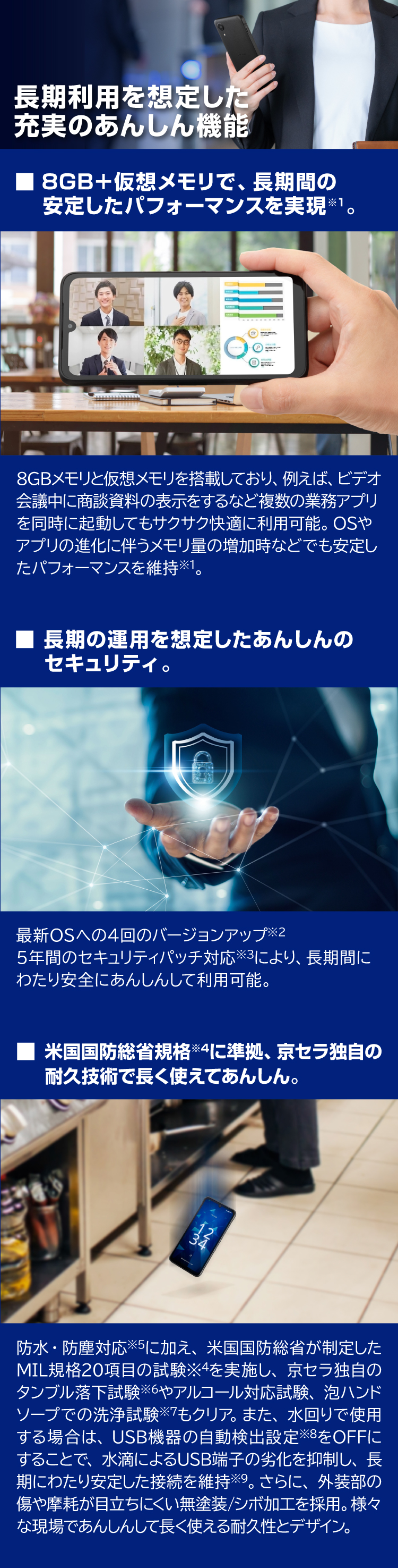 | 高耐久性 | MIL-std-810H 全20項目、1.5m鋼板への落下、1.0m鋼板タンブル落下 |